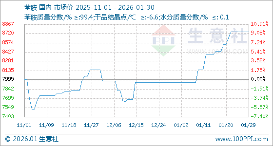 1月30日,生意社苯胺基准价为8745.00元/吨,与本月初(7945.00元/吨)相比,上涨了10.07%。