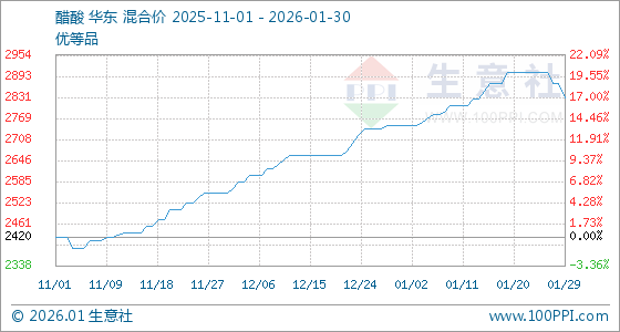 1月30日,生意社醋酸基准价为2830.00元/吨,与本月初(2750.00元/吨)相比,上涨了2.91%。