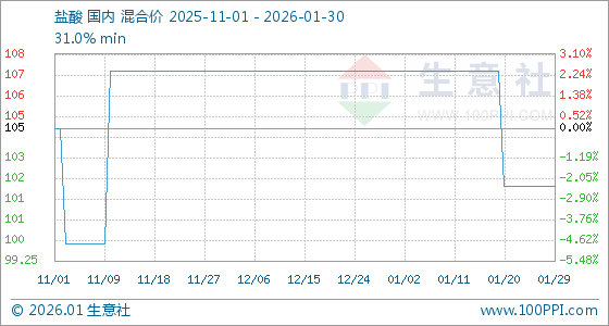 1月30日,生意社盐酸基准价为102.50元/吨,与本月初(107.50元/吨)相比,下降了4.65%。