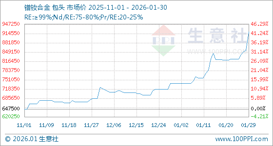 1月30日,生意社镨钕合金基准价为920000.00元/吨,与本月初(737500.00元/吨)相比,上涨了24.75%。