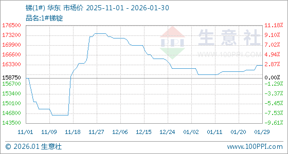 1月30日,生意社锑(1#)基准价为163000.00元/吨,与本月初(162000.00元/吨)相比,上涨了0.62%。