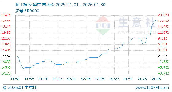 1月30日,生意社顺丁橡胶基准价为13200.00元/吨,与本月初(11580.00元/吨)相比,上涨了13.99%。