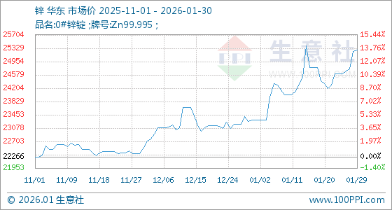 1月30日,生意社锌基准价为25280.00元/吨,与本月初(23302.00元/吨)相比,上涨了8.49%。