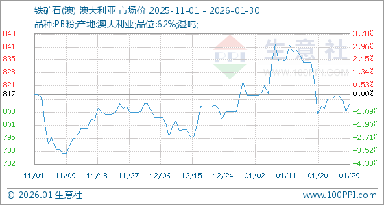 1月30日,生意社铁矿石(澳)基准价为812.78元/吨,与本月初(817.11元/吨)相比,下降了0.53%。