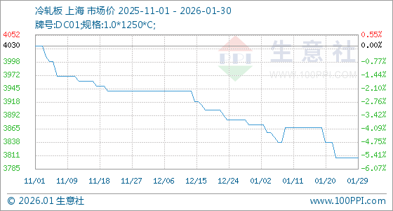 1月30日,生意社冷轧板基准价为3807.50元/吨,与本月初(3872.50元/吨)相比,下降了1.68%。