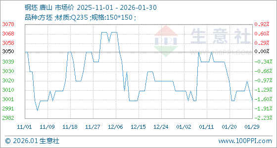 1月30日,生意社钢坯基准价为3000.00元/吨,与本月初(3010.00元/吨)相比,下降了0.33%。