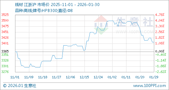 1月30日,生意社线材基准价为3407.50元/吨,与本月初(3500.00元/吨)相比,下降了2.64%。