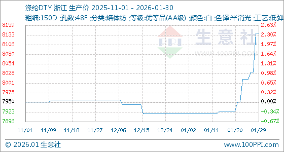 1月30日,生意社涤纶DTY基准价为8137.50元/吨,与本月初(7918.75元/吨)相比,上涨了2.76%。