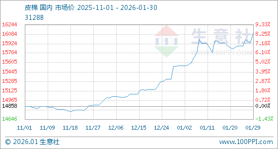 1月30日,生意社皮棉基准价为16111.17元/吨,与本月初(15549.17元/吨)相比,上涨了3.61%。