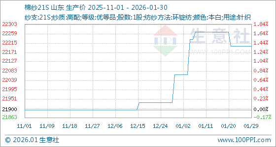 1月30日,生意社棉纱21S基准价为22200.00元/吨,与本月初(22066.67元/吨)相比,上涨了0.60%。