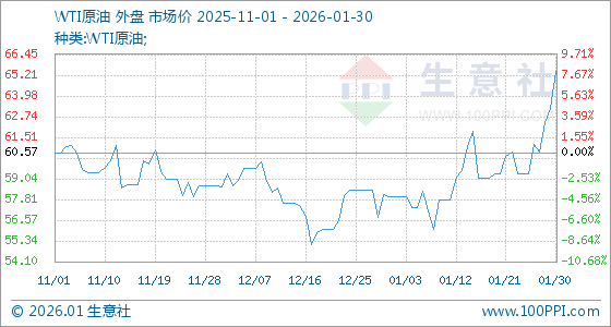 1月30日,生意社WTI原油基准价为63.21美元/桶,与本月初(57.95美元/桶)相比,上涨了9.08%。