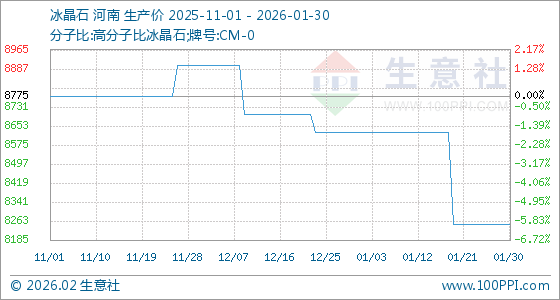 1月30日,生意社冰晶石基准价为8250.00元/吨,与本月初(8625.00元/吨)相比,下降了4.35%。
