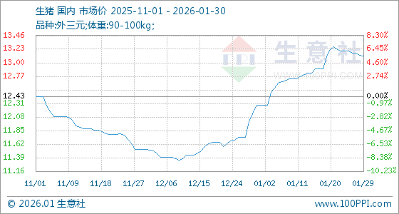 1月30日,生意社生猪基准价为13.12元/公斤,与本月初(12.28元/公斤)相比,上涨了6.84%。