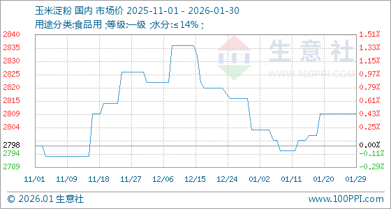 1月30日,生意社玉米淀粉基准价为2810.00元/吨,与本月初(2804.00元/吨)相比,上涨了0.21%。