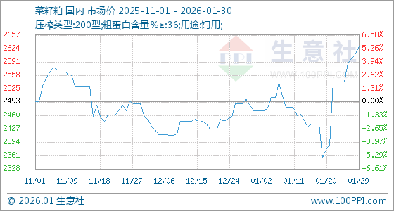 1月30日,生意社菜籽粕基准价为2630.00元/吨,与本月初(2471.67元/吨)相比,上涨了6.41%。
