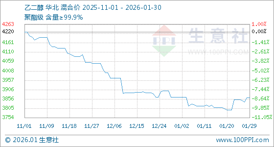 1月30日,生意社乙二醇基准价为3861.67元/吨,与本月初(3864.17元/吨)相比,下降了0.06%。