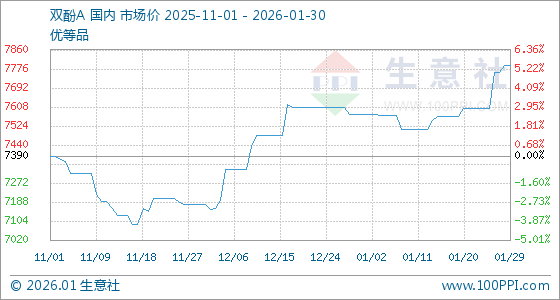 1月30日,生意社双酚A基准价为7790.00元/吨,与本月初(7576.00元/吨)相比,上涨了2.82%。