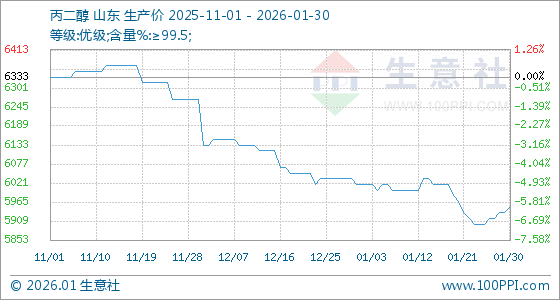 1月30日,生意社丙二醇基准价为5933.33元/吨,与本月初(6016.67元/吨)相比,下降了1.39%。