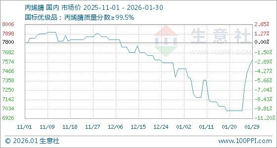 1月30日,生意社丙烯腈基准价为7600.00元/吨,与本月初(7500.00元/吨)相比,上涨了1.33%。
