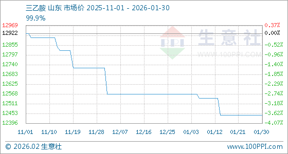 1月30日,生意社三乙胺基准价为12444.44元/吨,与本月初(12566.67元/吨)相比,下降了0.97%。