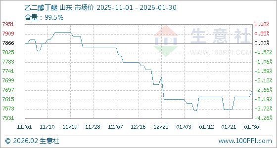 1月30日,生意社乙二醇丁醚基准价为7628.57元/吨,与本月初(7616.67元/吨)相比,上涨了0.16%。