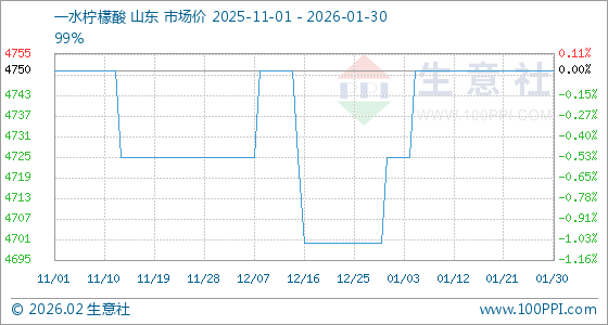 1月30日,生意社一水柠檬酸基准价为4750.00元/吨,与本月初(4725.00元/吨)相比,上涨了0.53%。
