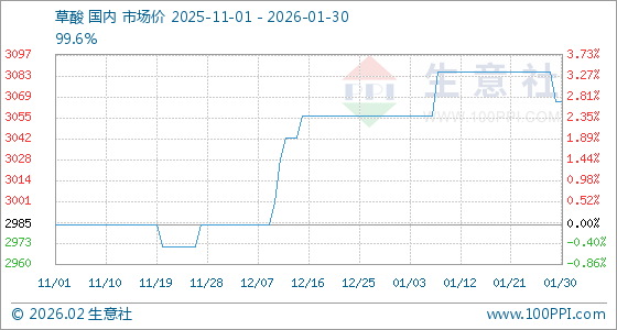 1月30日,生意社草酸基准价为3066.67元/吨,与本月初(3057.14元/吨)相比,上涨了0.31%。