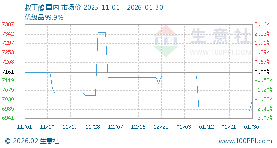 1月30日,生意社叔丁醇基准价为6978.57元/吨,与本月初(7141.67元/吨)相比,下降了2.28%。