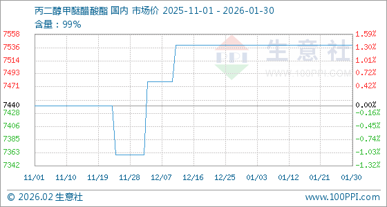 1月30日,生意社丙二醇甲醚醋酸酯基准价为7540.00元/吨,与本月初持平。