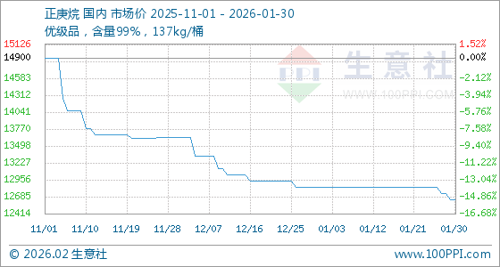 1月30日,生意社正庚烷基准价为12640.00元/吨,与本月初(12840.00元/吨)相比,下降了1.56%。