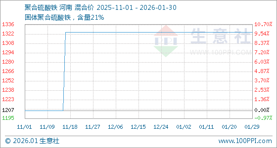 1月30日,生意社聚合硫酸铁基准价为1325.00元/吨,与本月初持平。