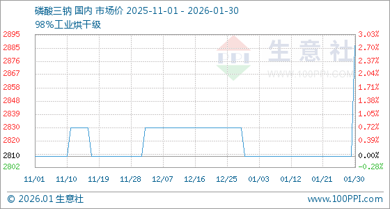 1月30日,生意社磷酸三钠基准价为2810.00元/吨,与本月初持平。
