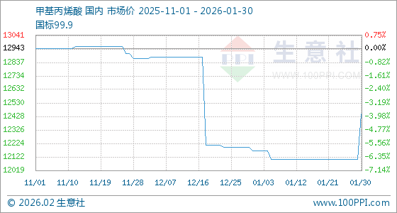 1月30日,生意社甲基丙烯酸基准价为12105.00元/吨,与本月初(12167.50元/吨)相比,下降了0.51%。