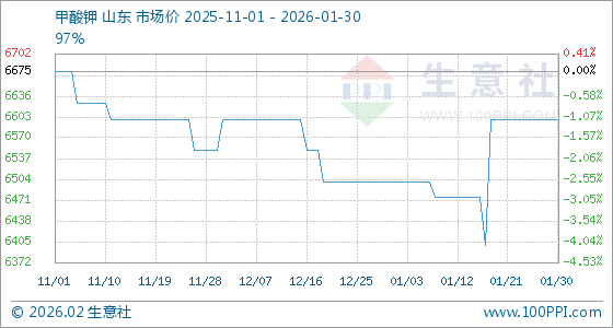 1月30日,生意社甲酸钾基准价为6600.00元/吨,与本月初(6500.00元/吨)相比,上涨了1.54%。