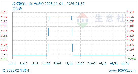 1月30日,生意社柠檬酸钠基准价为5166.67元/吨,与本月初持平。