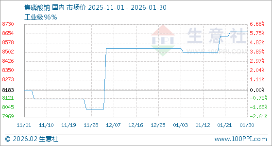 1月30日,生意社焦磷酸钠基准价为8666.67元/吨,与本月初(8533.33元/吨)相比,上涨了1.56%。