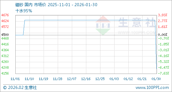 1月30日,生意社硼砂基准价为4633.33元/吨,与本月初持平。