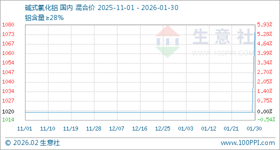 1月30日,生意社碱式氯化铝基准价为1020.00元/吨,与本月初持平。