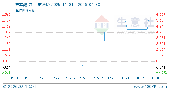 1月30日,生意社异辛酸基准价为11500.00元/吨,与本月初持平。