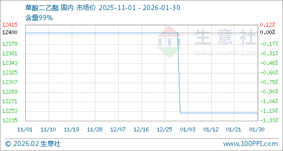 1月30日,生意社草酸二乙酯基准价为12250.00元/吨,与本月初持平。