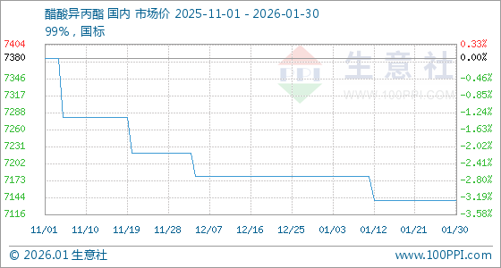 1月30日,生意社醋酸异丙酯基准价为7140.00元/吨,与本月初(7180.00元/吨)相比,下降了0.56%。