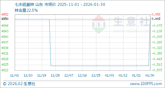1月30日,生意社七水硫酸锌基准价为4825.00元/吨,与本月初持平。