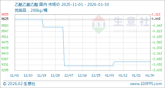 1月30日,生意社乙酰乙酸乙酯基准价为9350.00元/吨,与本月初(9325.00元/吨)相比,上涨了0.27%。
