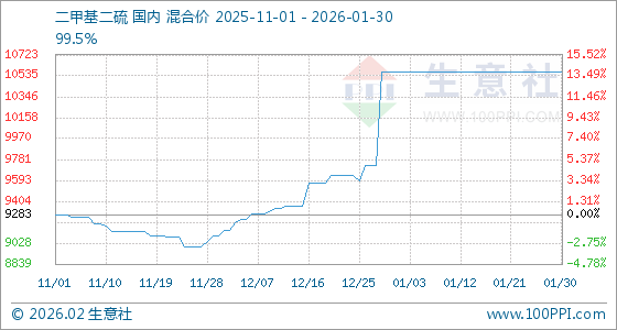 1月30日,生意社二甲基二硫基准价为10566.67元/吨,与本月初持平。