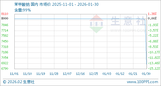 1月30日,生意社苯甲酸钠基准价为7966.67元/吨,与本月初(8000.00元/吨)相比,下降了0.42%。