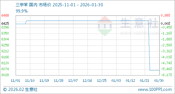 1月30日,生意社三甲苯基准价为6066.67元/吨,与本月初(6450.00元/吨)相比,下降了5.94%。