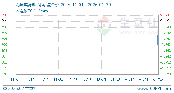 1月30日,生意社无烟煤滤料基准价为723.33元/吨,与本月初持平。