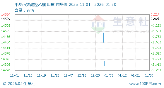 1月30日,生意社甲基丙烯酸羟乙酯基准价为14300.00元/吨,与本月初持平。