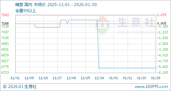 1月30日,生意社精萘基准价为6766.67元/吨,与本月初持平。