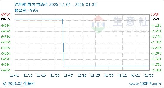 1月30日,生意社对苯醌基准价为64500.00元/吨,与本月初持平。